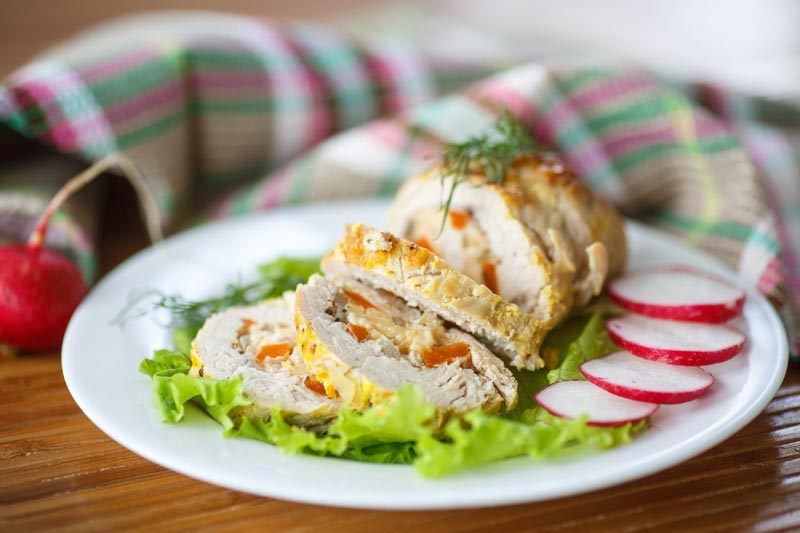 Нарежьте грудку индейки на более мелкие кубики и начните жарить ее на горячем масле в кастрюле большего размера. Тем временем мелко нарежьте лук и чеснок, а когда мясо станет мягким, добавьте их в кастрюлю, приправьте солью и перцем и обжаривайте вместе около 2 минут. Влейте вино и немного бульона, накройте крышкой и дайте покипеть около 15 минут.